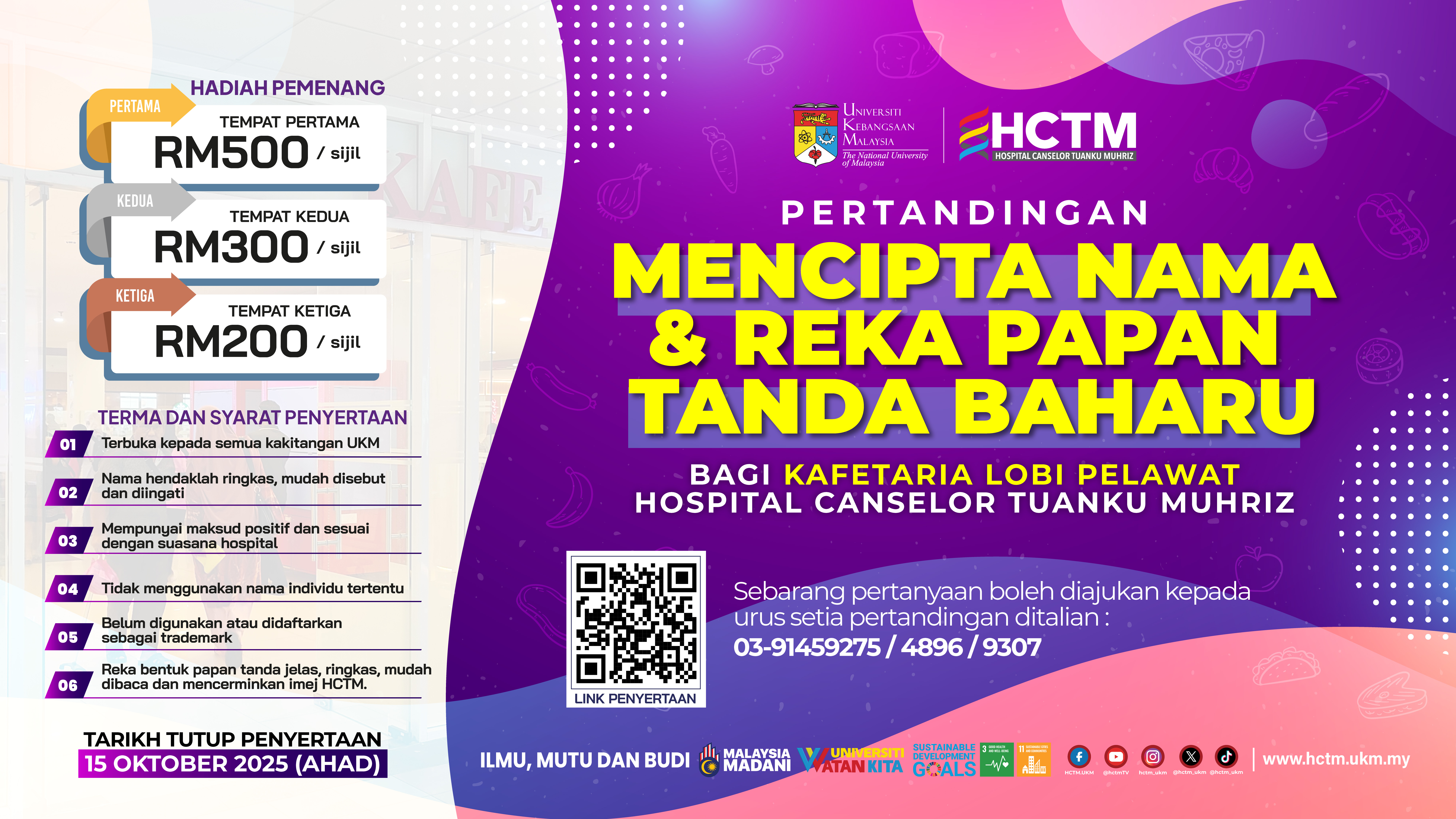 Hospital Canselor Tuanku Muhriz dengan sukacitanya menjemput semua kakitangan UKM untuk menyertai pertandingan mencipta nama dan mereka bentuk papan tanda baharu bagi Kafeteria Lobi Pelawat HCTM. Hadiah Menarik Menanti Pemenang.