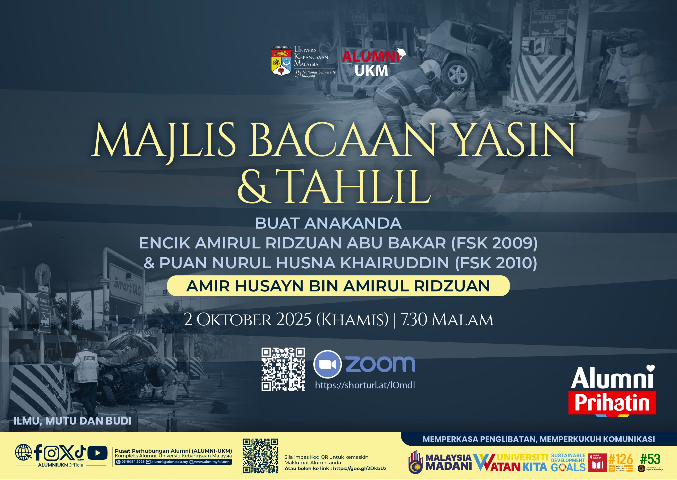 Pihak ALUMNI UKM dengan kerjasama Pusat Islam UKM akan mengadakan Majlis Bacaan Tahlil dan Yasin secara atas talian buat anak Pn. Nurul Husna Khairuddin (FSK 2010) dan En. Amirul Ridzuan Abu Bakar (FSK 2009).