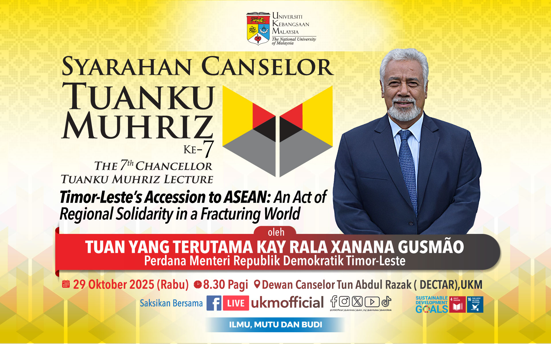 Adalah dimaklumkan bahawa bahawa Universiti Kebangsaan Malaysia (UKM) akan mengadakan Majlis Syarahan Canselor Tuanku Muhriz Ke-7 bertajuk “Timor Leste’s Accession to ASEAN: An Act of Regional Solidarity in a Fracturing World” yang akan disampaikan oleh Tuan Yang Terutama Kay Rala Xanana Gusmão, Perdana Menteri Republik Demokratik Timor Leste.