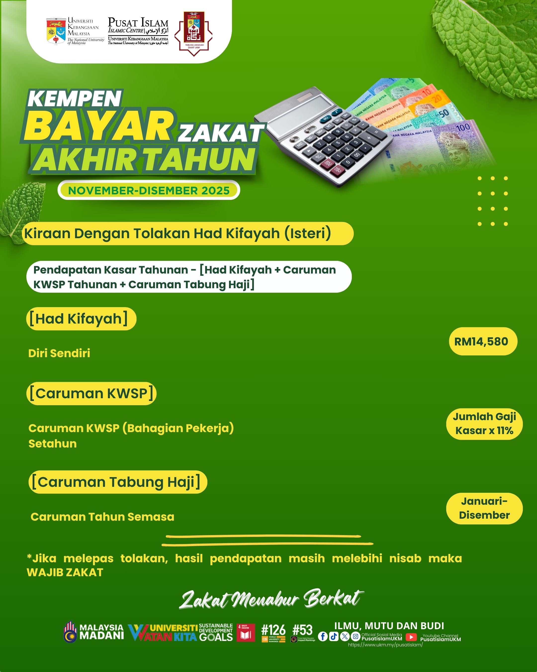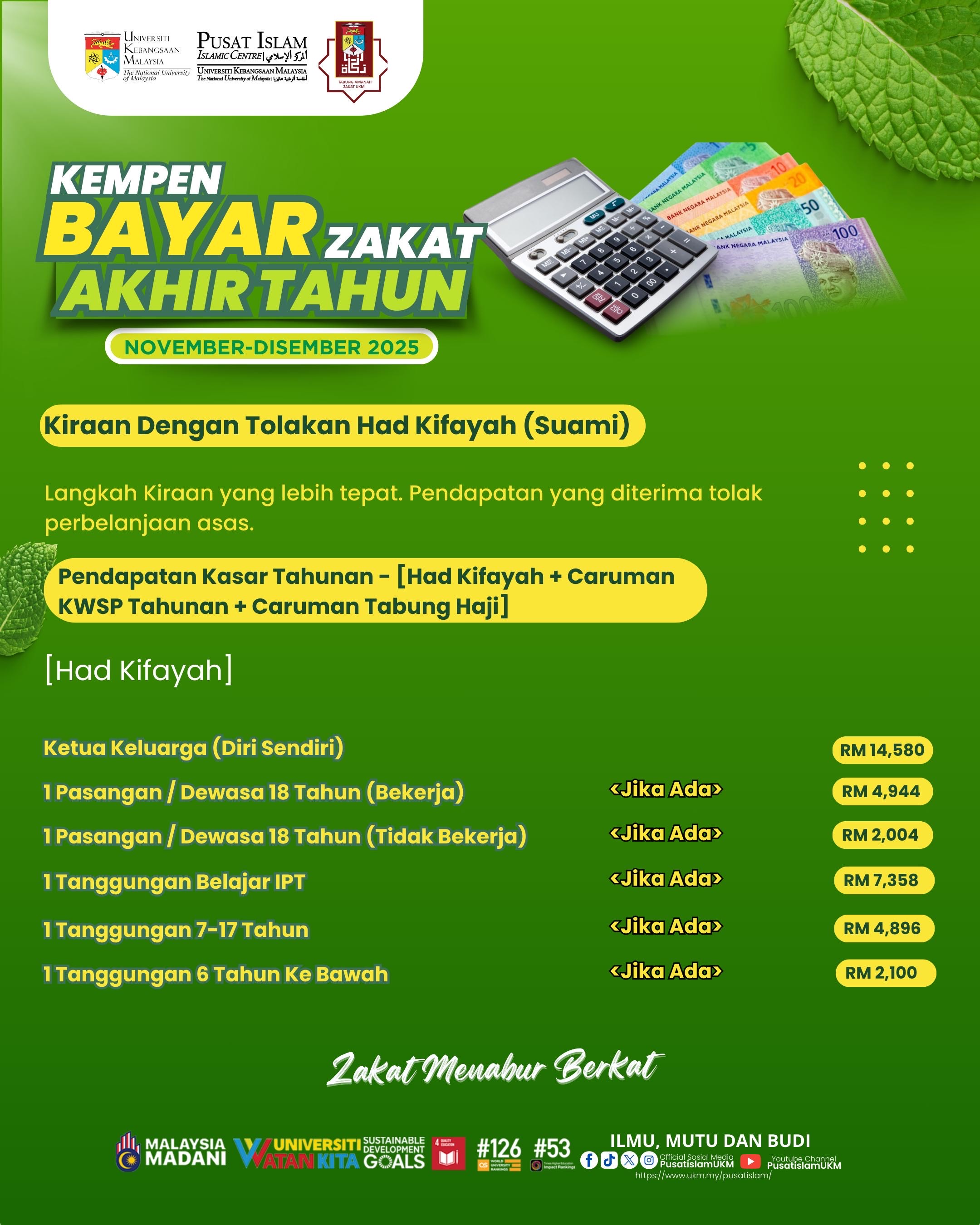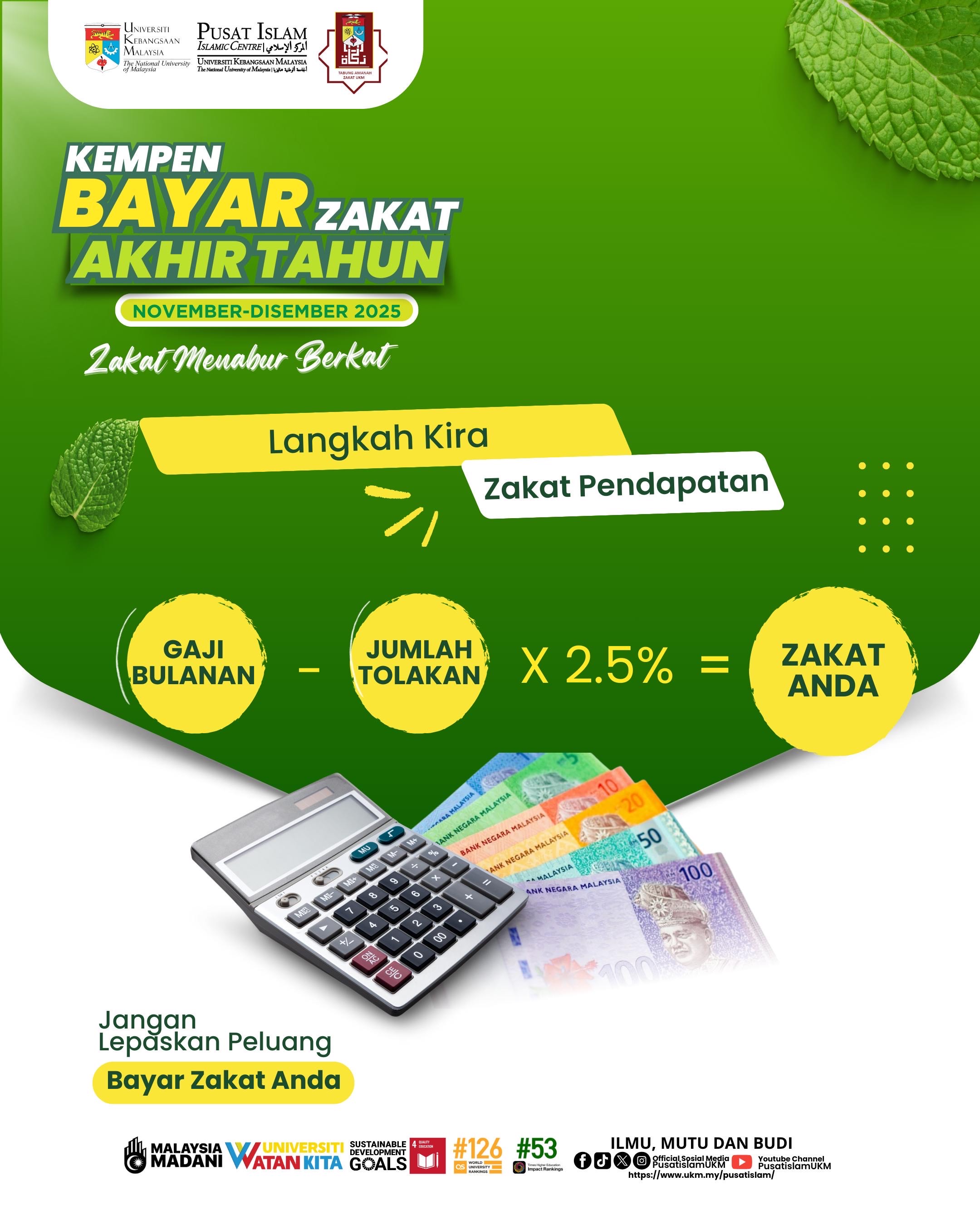 atau bayar di Kaunter Zakat UKM, Aras 1 Masjid Universiti. Kira semula zakat anda di kalkulator yang disediakan https://www.zakatselangor.com.my/kira-zakat/