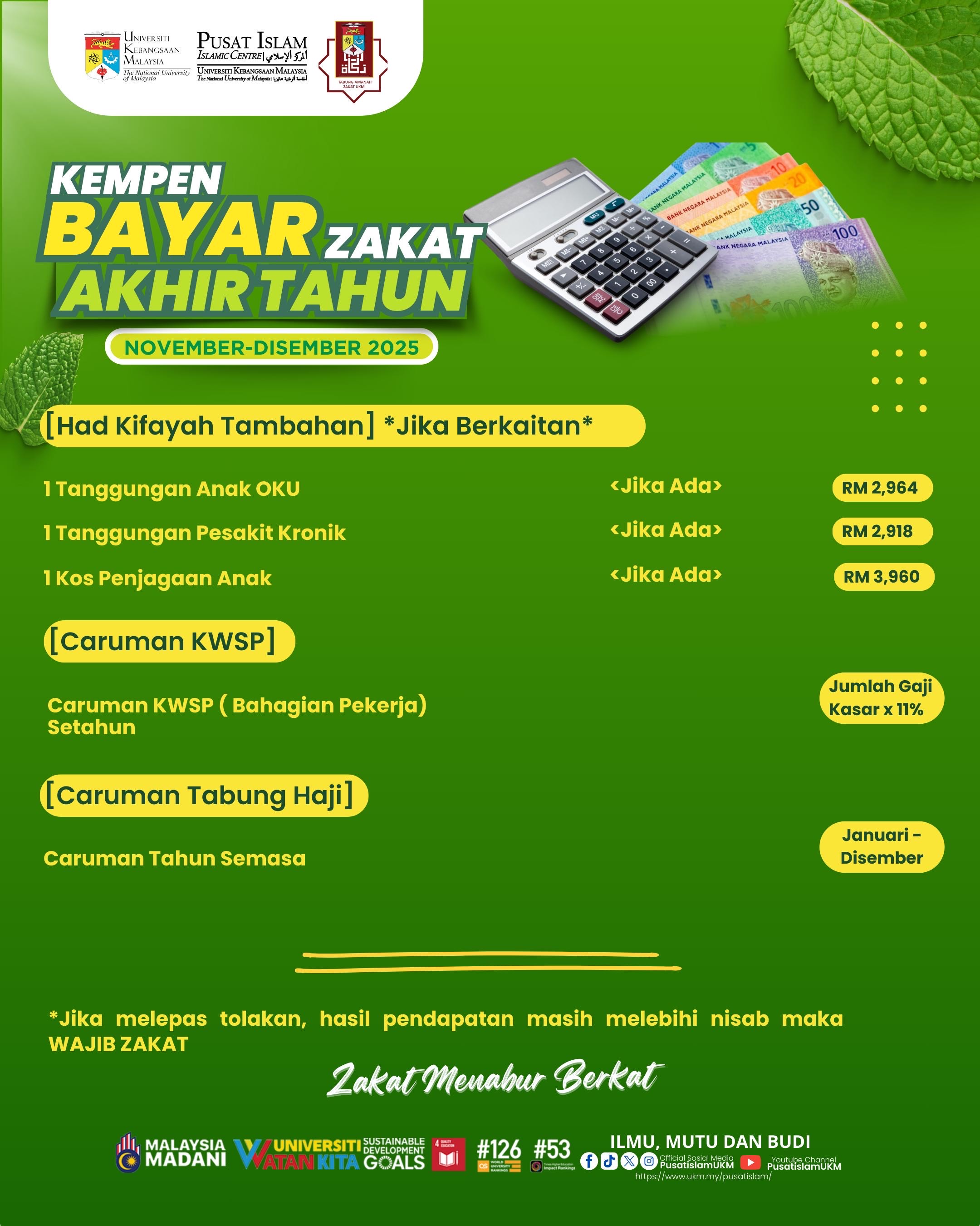 Warga UKM dipelawa untuk menunaikan kewajiban berzakat melalui kaedah potongan gaji secara bulanan. Hubungi Kaunter Zakat UKM untuk taksir semula kadar potongan zakat di talian 03-8921 4225/ 5820 (Bangi) 03-9145 6526 (KKL). Sila klik URL di bawah untuk e-borang SPG : https://www.ukm.my/pusatislam/bayaran-zakat-melalui-potongan-gaji/