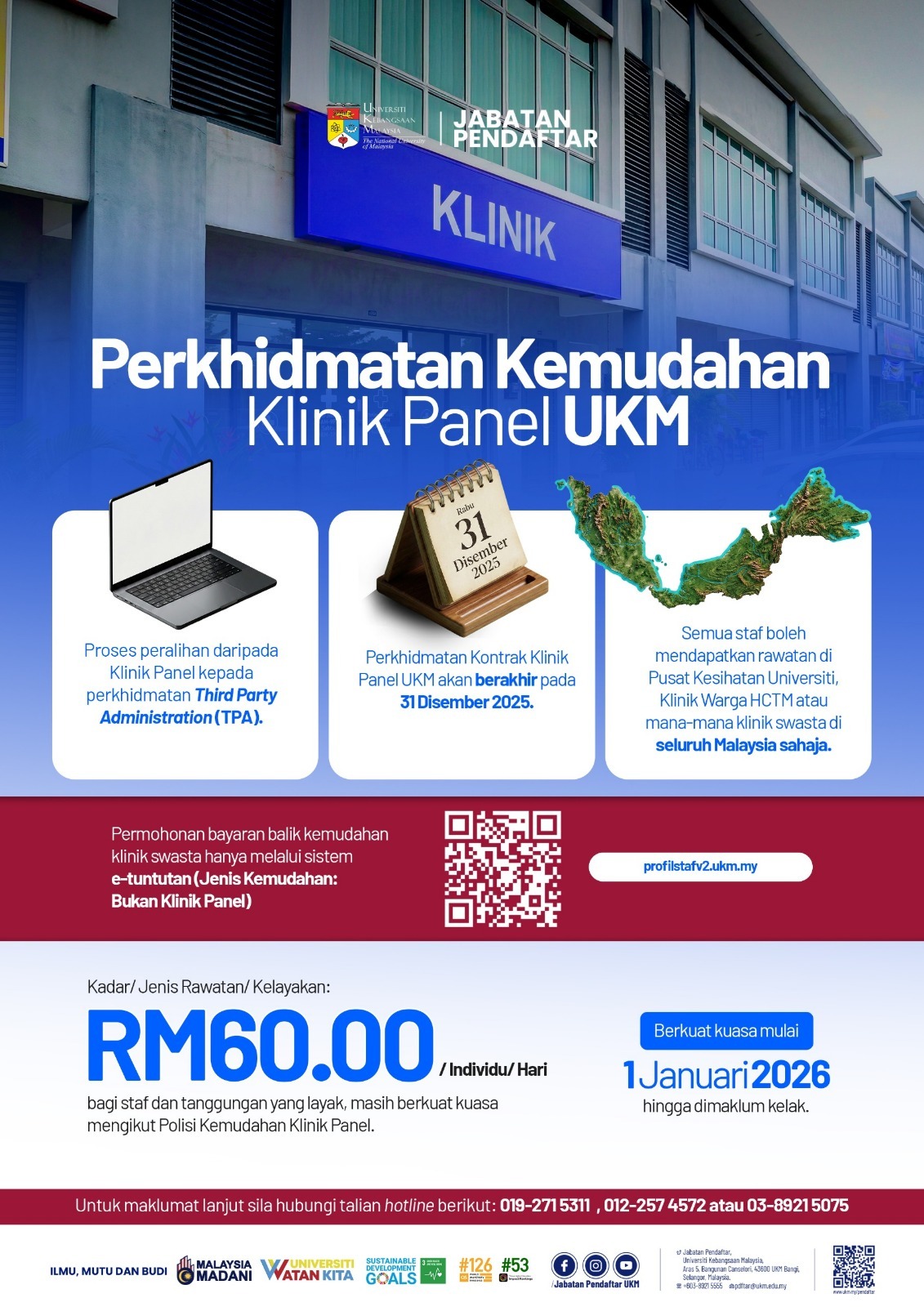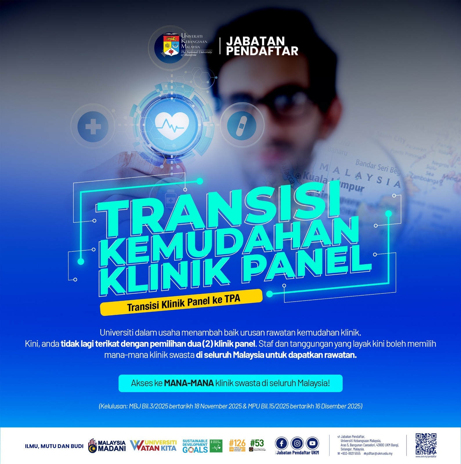 Sehubungan dengan itu, bersama-sama ini dilampirkan Pekeliling Jabatan Pendaftar Bil. 22/2025 mengenai Pemakluman Proses Transisi Kemudahan Klinik Panel UKM Tahun 2026 untuk perhatian/tindakan selanjutnya.