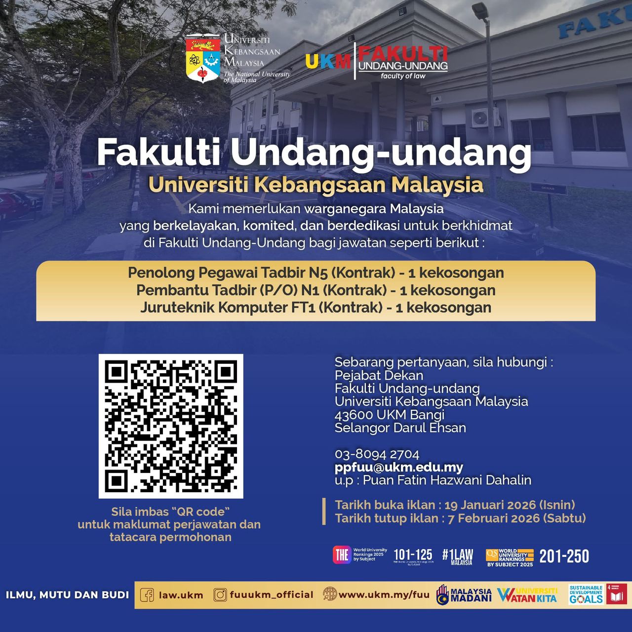 Fakulti Undang-undang, Universiti Kebangsaan Malaysia (UKM) mempelawa Warganegara Malaysia yang berkelayakan, komited dan berdedikasi untuk berkhidmat bagi jawatan berikut :